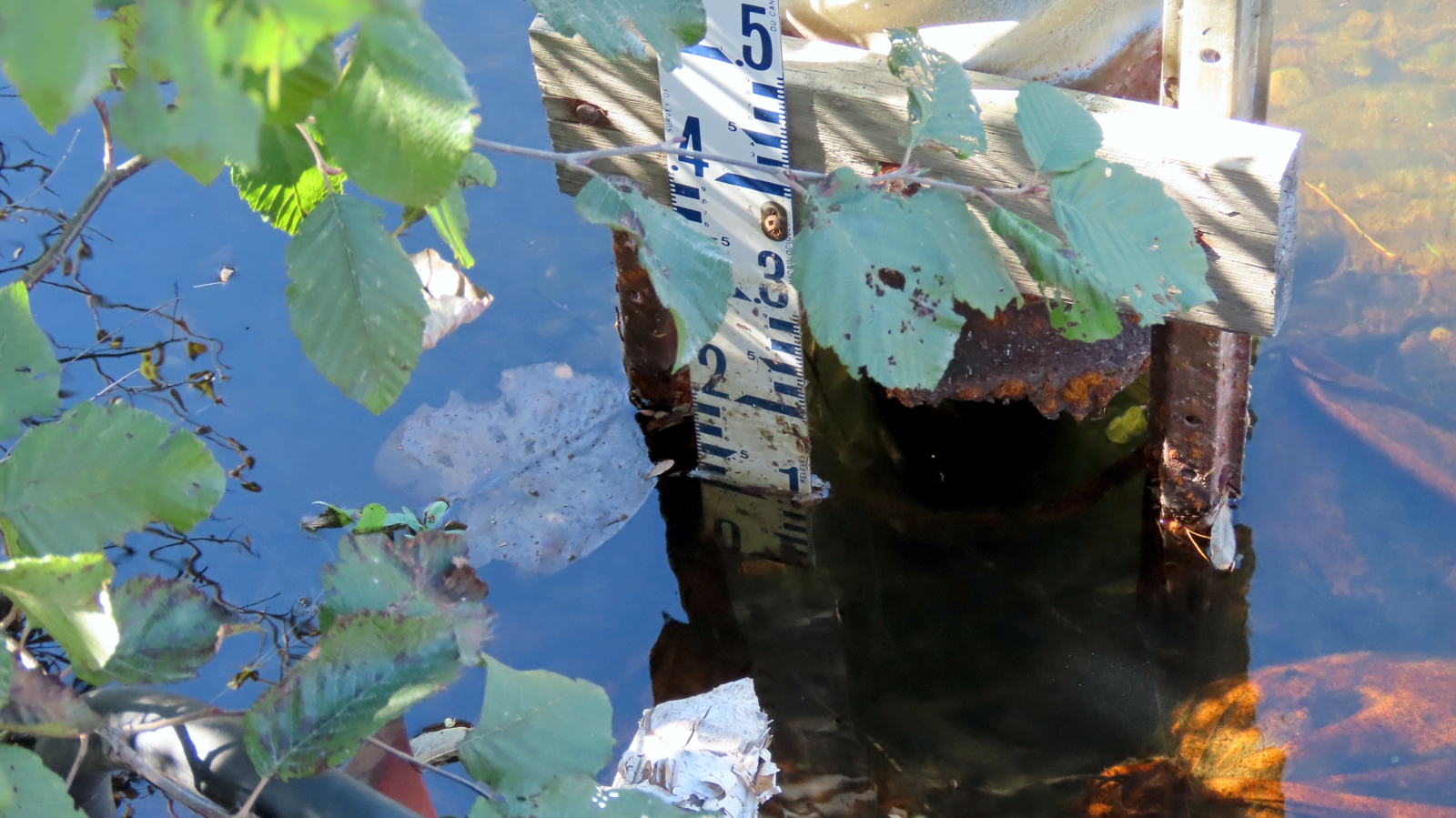 Lake Level: Took a picture of the lake level marker at the outlet Sept. 26. It's at the "1" on the marker stick now. There appears to be almost no flow out of the lake right now.
